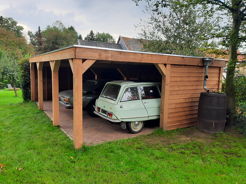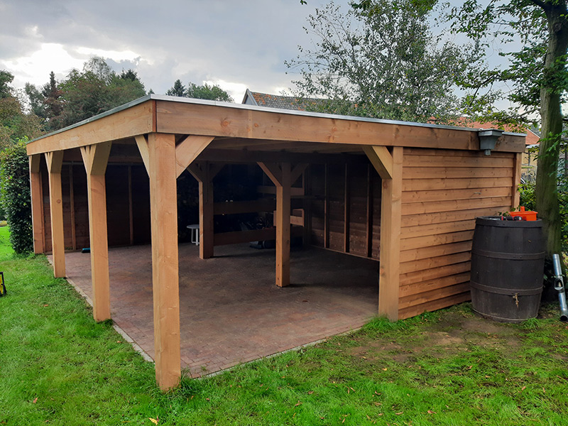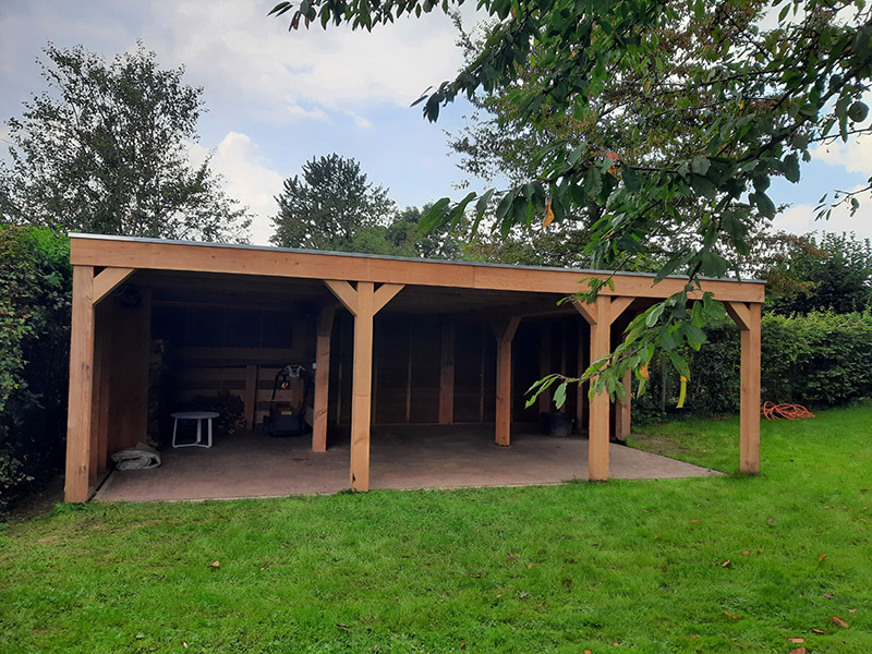 In de achtertuin is een multifunctionele overkapping gebouwd. Het is een carport voor de oldtimers. En daarnaast ook nog opslag voor de tuinmeubels, tuingereedschap en kachelhout. Constructie van Douglas hout. Dak afgewerkt met EPDM. Wanden betimmerd met modiwood.