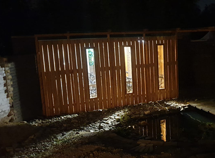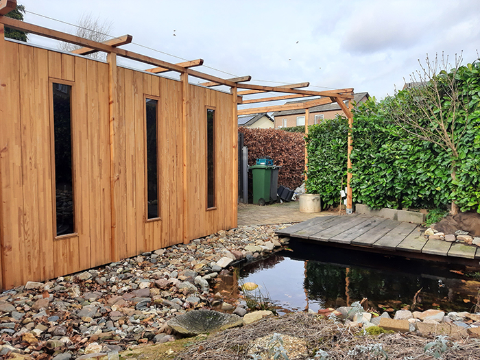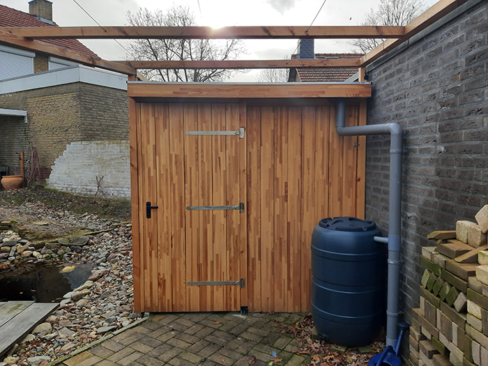 In deze tuin is een houten schuur gebouwd voor tuingereedschap en fietsen. De pergolastructuur naast de schuur loopt door over het dak, zodat dit ook kan begroeien. Er is een vlonder bij de vijver gemaakt. De regenwaterafvoer wordt opgevangen in de tuin en gaat niet naar het riool. Zodra de vijver overloopt wordt het water weggepompt.