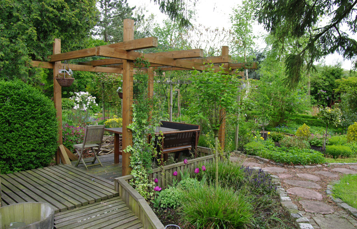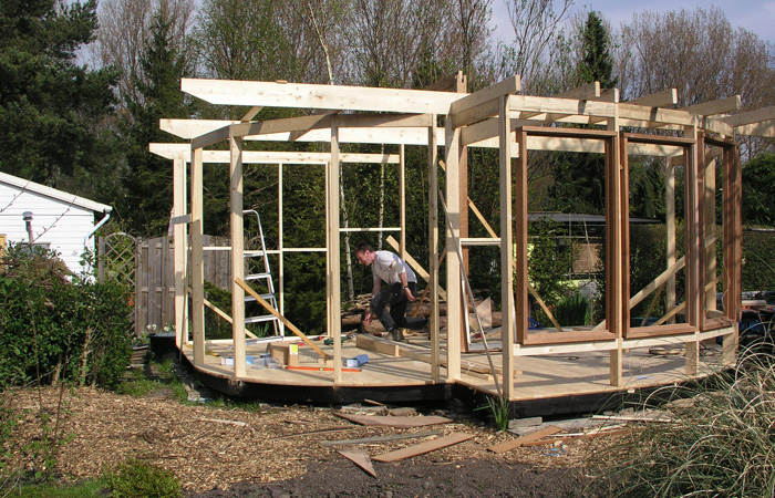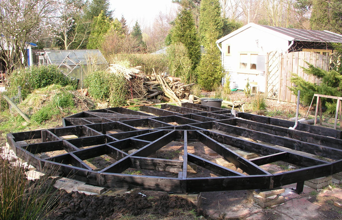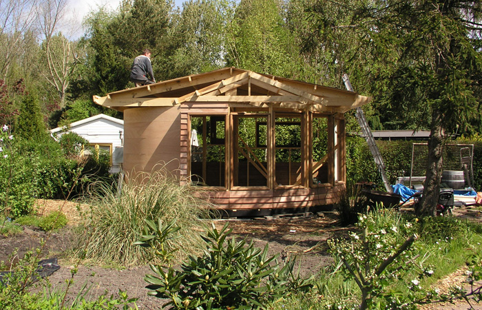 Mijn eigen volkstuinhuis met ronde wand en gemaakt met kozijnen van Marktplaats en speciale partijen hout. Een terras aan het tuinhuis naar het zitje met de pergola en zelfgemaakte houten tuinmeubels.
